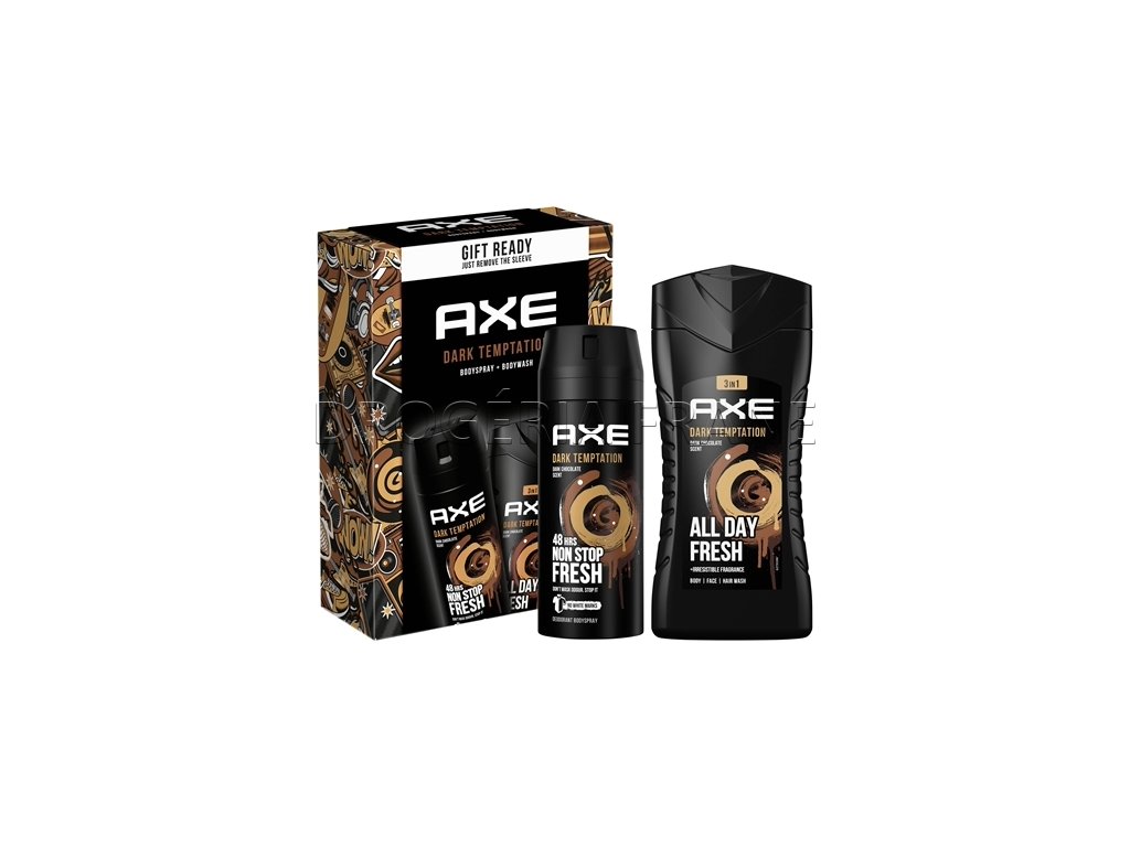 Axe balíček je tu pre každého muža, ktorý vie oceniť eleganciu a prahne za skvelou vôňou. Axe Dark Temtation je plný rafinovanej a neodolateľnej vône s nádychom čokolády, ktorá podčiarkne charizma a navyše príjemne osvieži po celý deň. Balíček obsahuje pánsky dezodorant, ktorý zaručí dlhotrvajúcu ochranu proti zápachu až 48 hodín, sprchový gél pre dôkladne čistú a sviežu pokožku, vodu po holení a kozmetickú tašku ako darček.