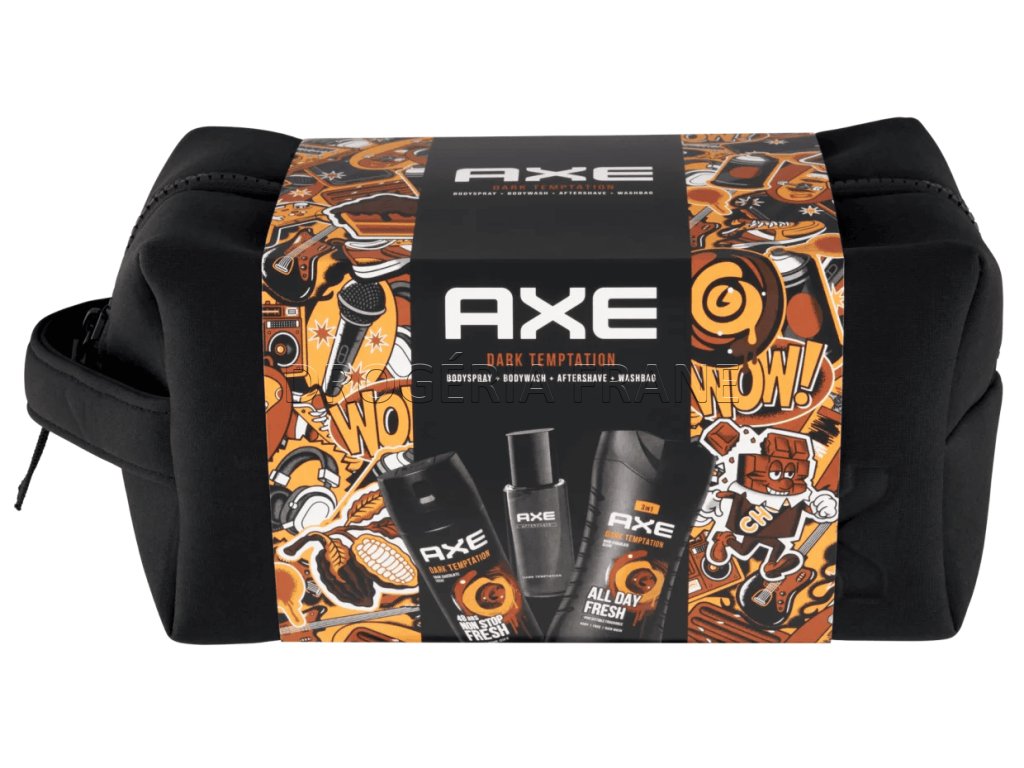 Axe balíček je tu pre každého muža, ktorý vie oceniť eleganciu a prahne za skvelou vôňou. Axe Dark Temtation je plný rafinovanej a neodolateľnej vône s nádychom čokolády, ktorá podčiarkne charizma a navyše príjemne osvieži po celý deň. Balíček obsahuje pánsky dezodorant, ktorý zaručí dlhotrvajúcu ochranu proti zápachu až 48 hodín, sprchový gél pre dôkladne čistú a sviežu pokožku, vodu po holení a kozmetickú tašku ako darček.